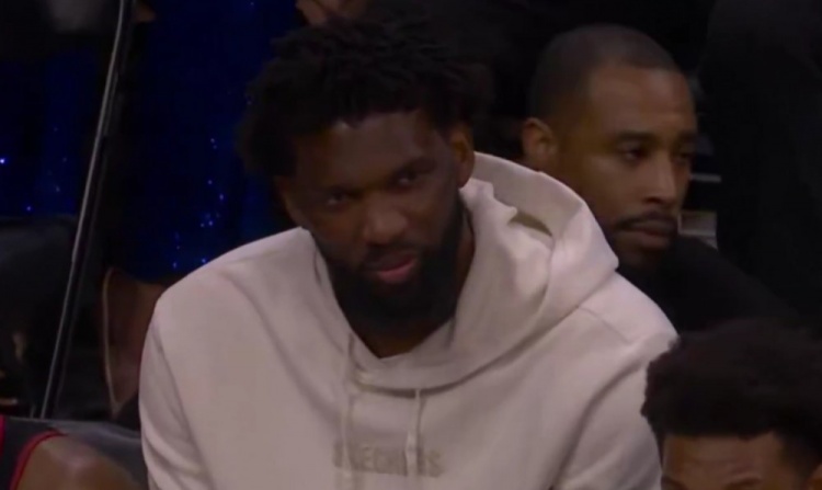 本场因右侧腹斜肌拉伤而缺席比赛的76人核心恩比德,在球队落后时坐在替补席面带笑意。
